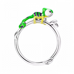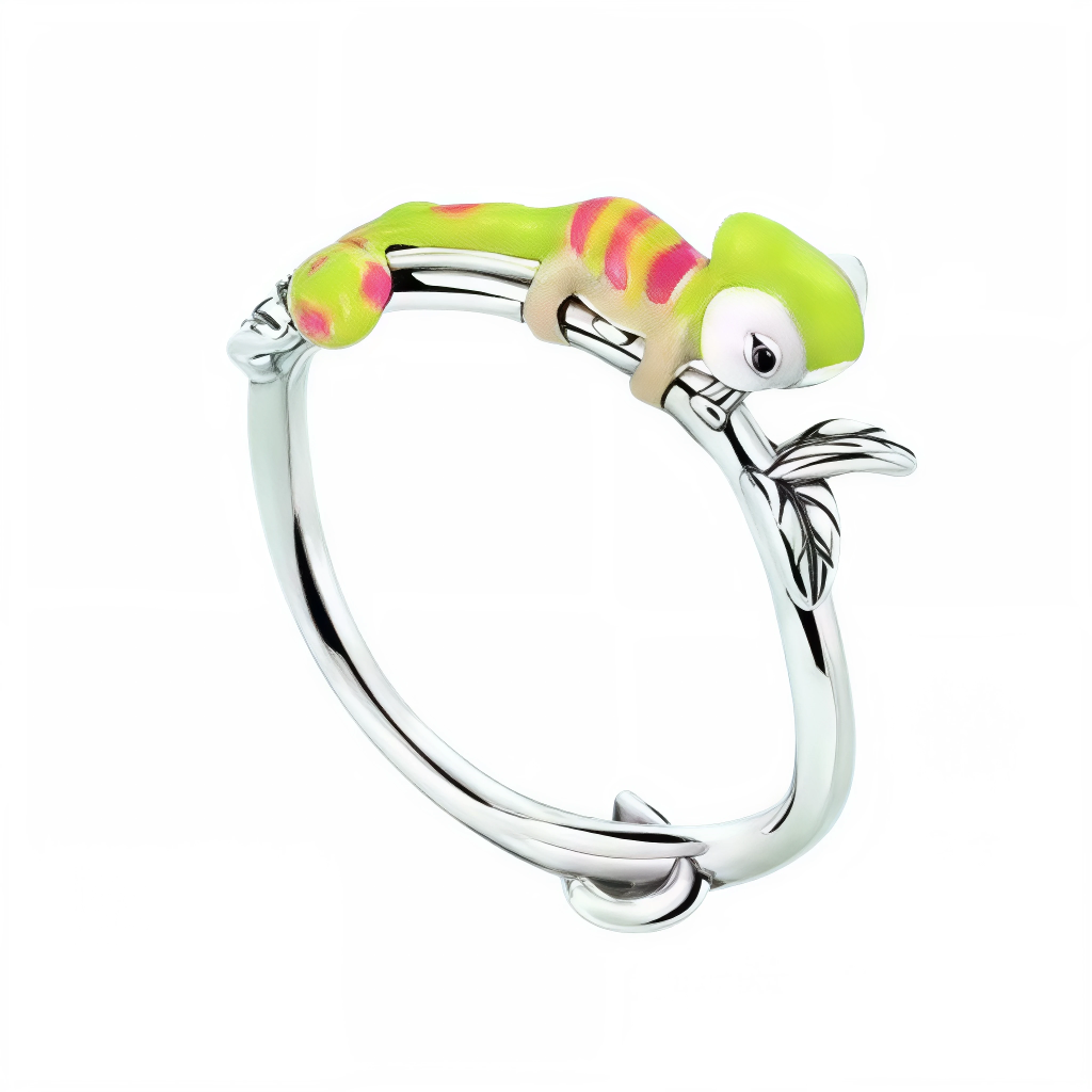 -Design : Caméléon finement sculpté posé sur l’anneau, effet thermosensible