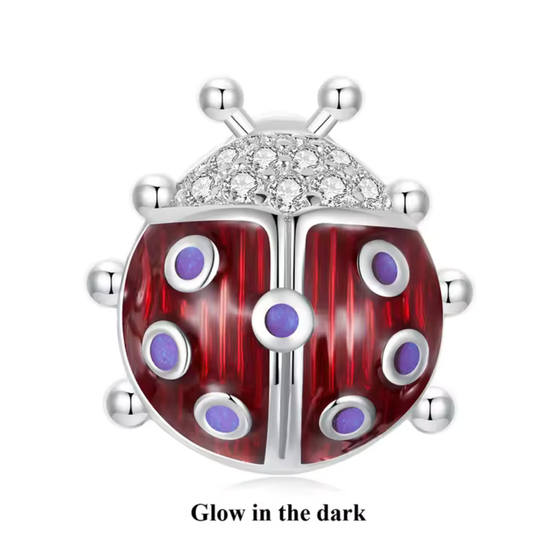 Charm en argent 925 représentant une coccinelle porte-bonheur aux détails soignés. Son effet "Glow in the Dark" lui permet de briller délicatement dans l’obscurité, ajoutant une touche de magie à ce symbole de chance et de nature. Idéal pour une création douce et lumineuse.