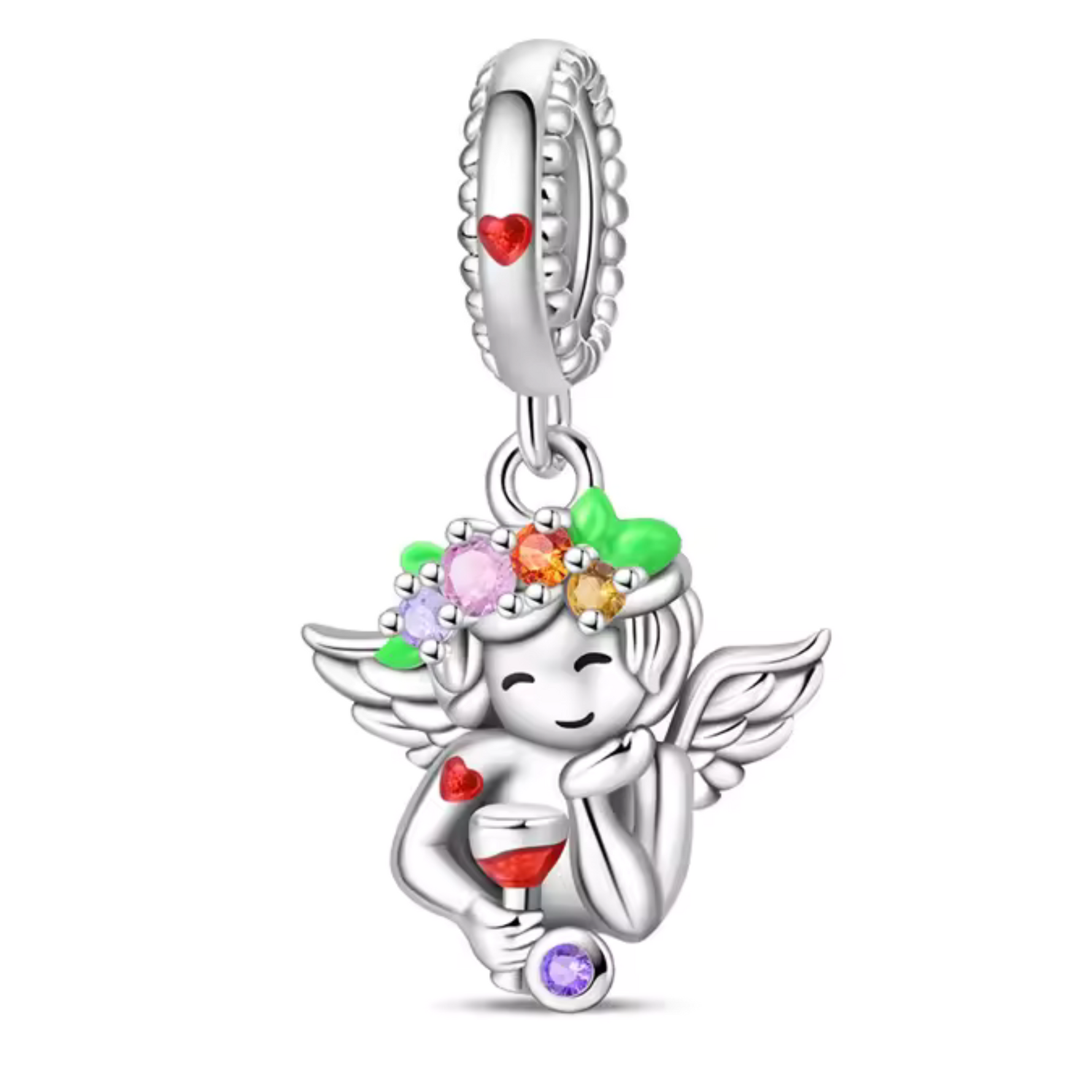 Découvrez ce charm raffiné représentant un ange élégant tenant un verre de vin. Finement travaillé en argent 925 et sublimé par des touches émaillées, ce bijou incarne la célébration, la douceur céleste et l’élégance intemporelle.