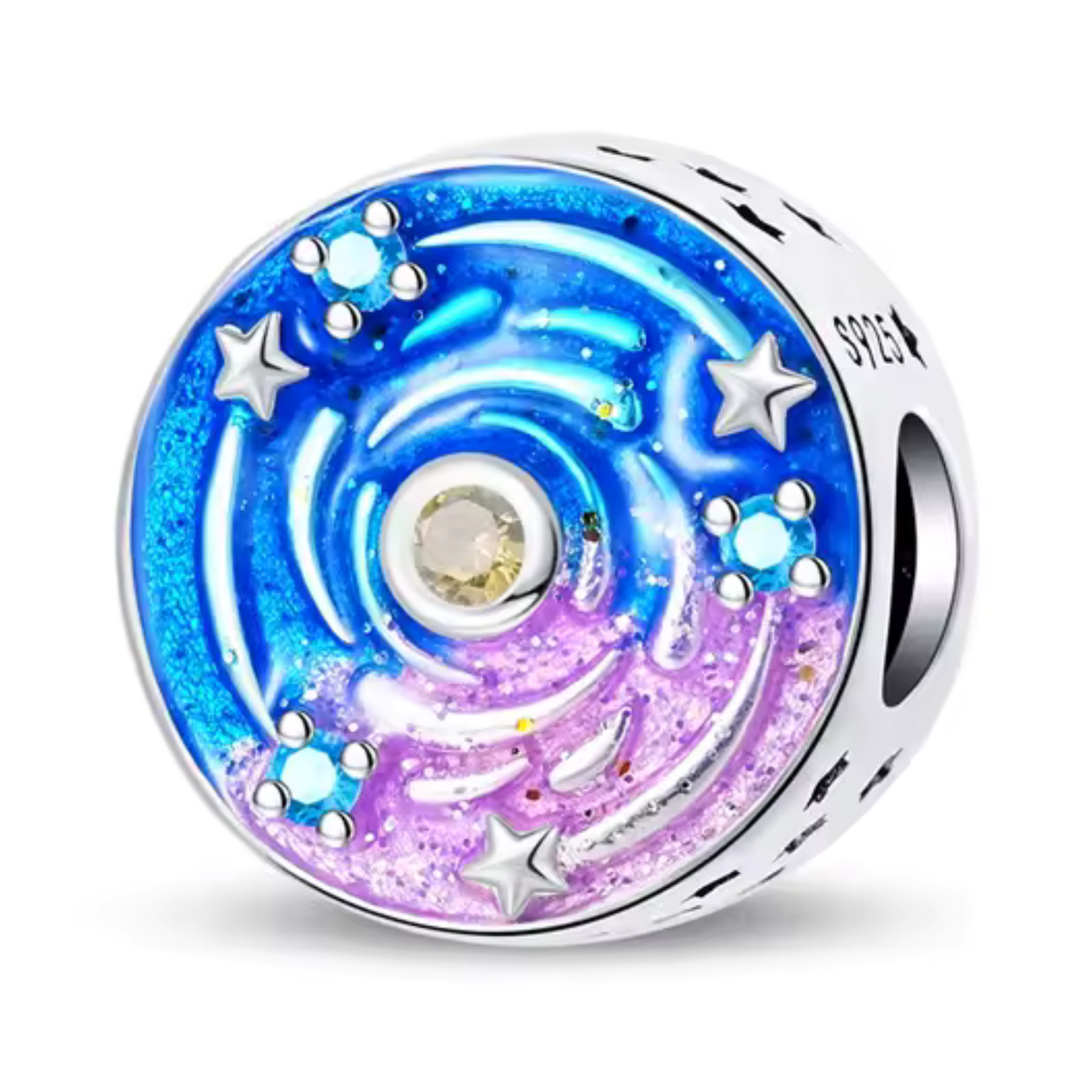 Apportez une touche de féérie et de mystère à votre bracelet avec ce charm en argent 925, orné d’un dégradé envoûtant de bleu et de violet, illuminé par de délicates étoiles. Symbole de rêve, d’infini et de guidance, ce bijou évoque la beauté du ciel nocturne et la magie des étoiles scintillantes.