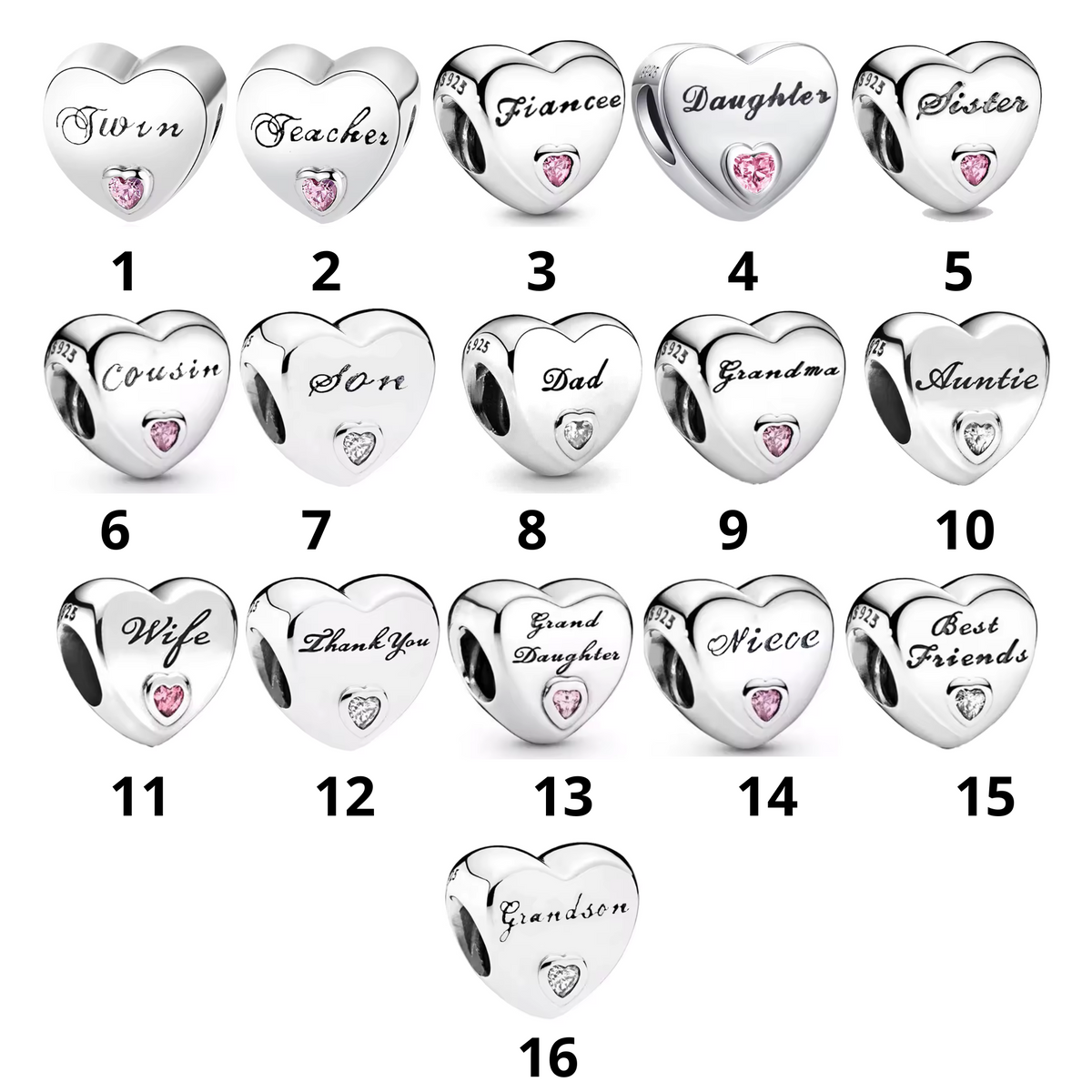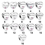 Découvrez notre collection spéciale de charms cœur, chacun représentant un membre ou un lien unique de la famille. Ces bijoux en métal argenté sont ornés de cristaux colorés, symbolisant l'amour et l'attention envers vos proches. Avec 16 inscriptions différentes disponibles, choisissez celui qui capture le mieux votre relation spéciale.