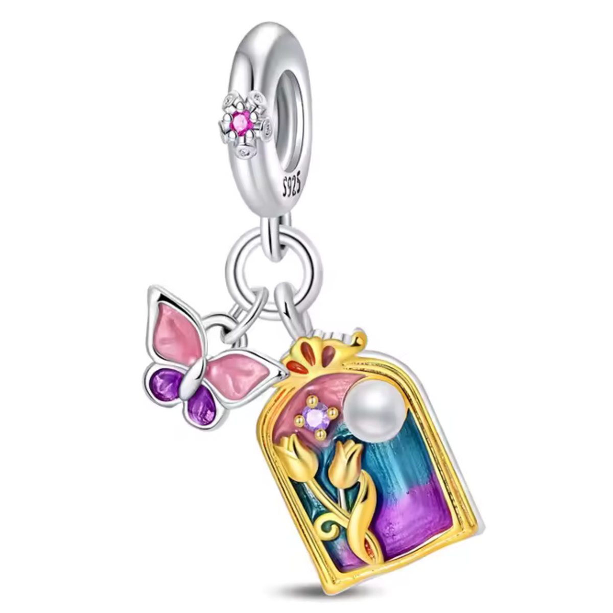 Apportez une touche de fraîcheur et de poésie à votre bracelet avec ce charm tableau en argent 925, délicatement orné de tulipes éclatantes et d’un papillon en plein envol. Symbole du printemps, de la renaissance et de la beauté éphémère, ce bijou capture l’élégance de la nature en fleurs.