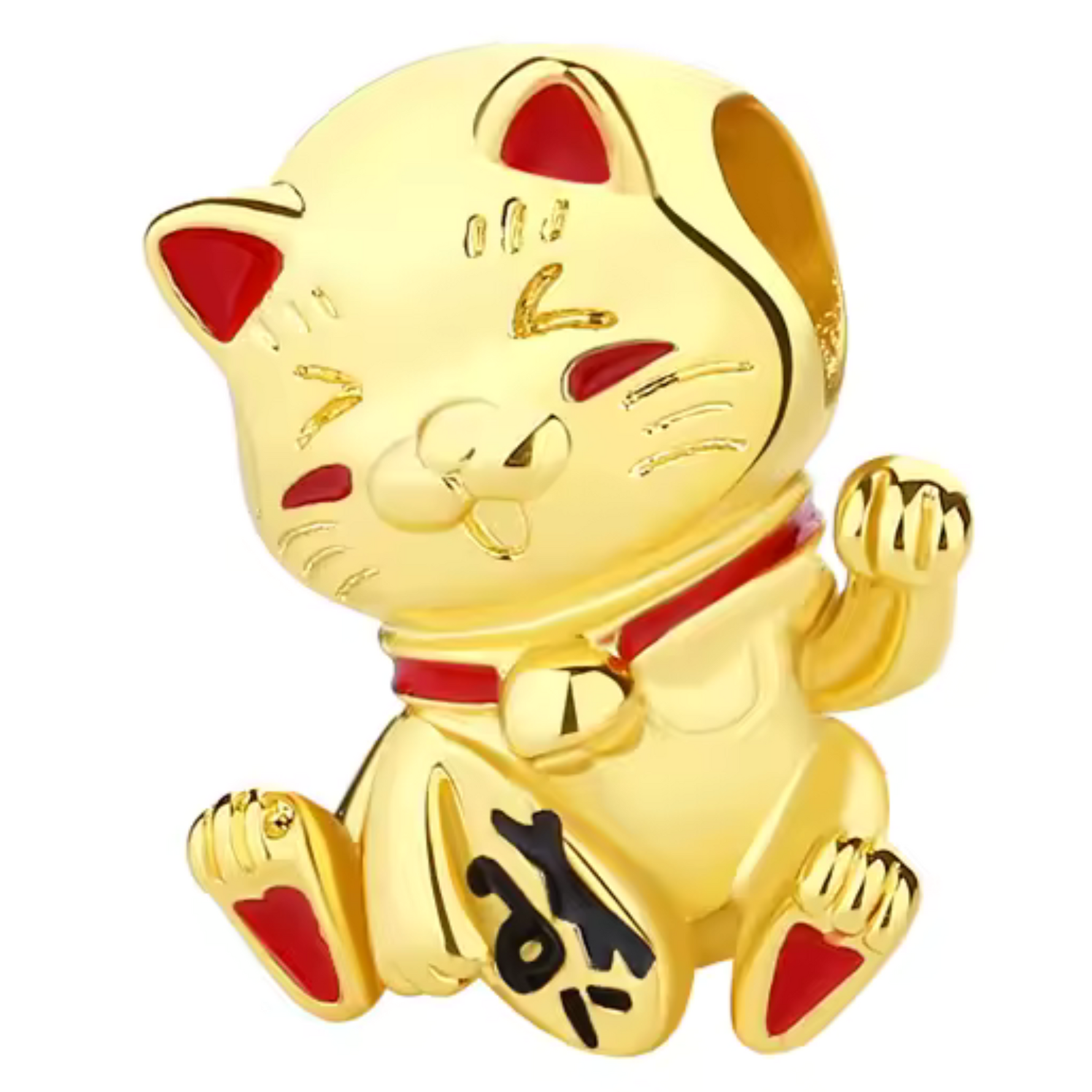 Ce charm en forme de chat porte-bonheur japonais (Maneki-neko) est un symbole traditionnel de chance et de prospérité. Entièrement doré, avec des détails rouges et noirs, il incarne une touche d’optimisme et de tradition asiatique dans votre collection de bijoux.