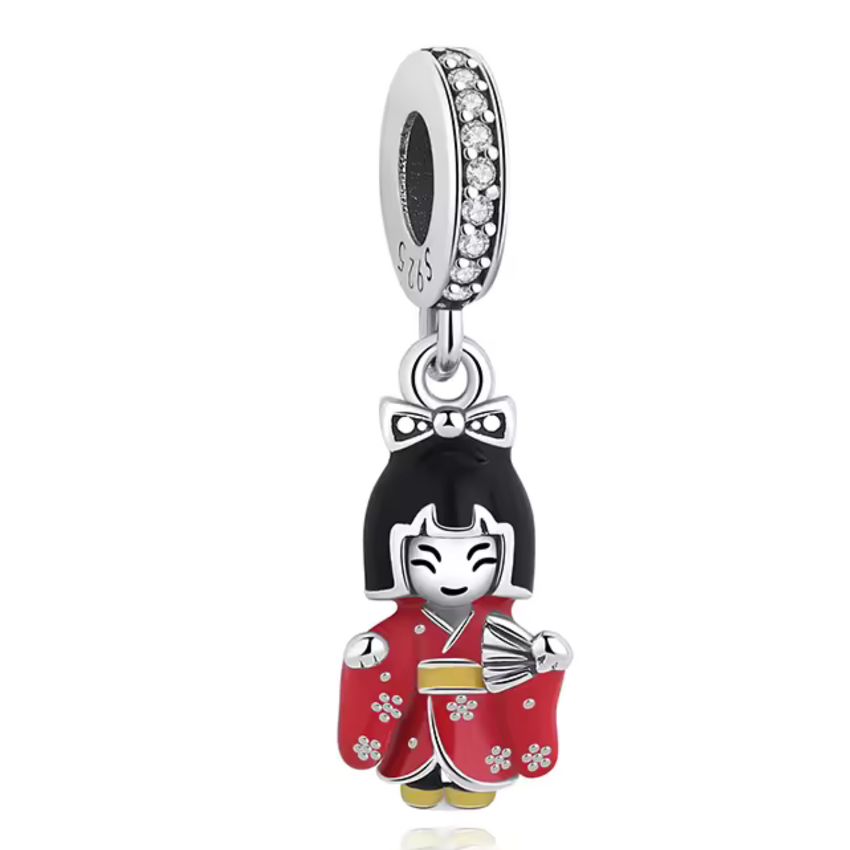 Ajoutez une touche de grâce à votre collection avec ce charm en forme de poupée kokeshi. Ce bijou élégant, vêtu d’un kimono rouge orné de fleurs et tenant un éventail, incarne la beauté intemporelle de la culture japonaise.