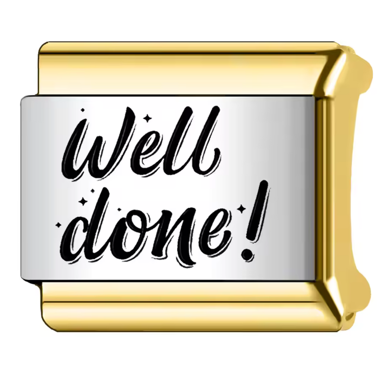 Charm italien bicolore, mêlant argenté et doré, avec l’inscription “Well done !”. Un pendentif motivant et positif, idéal pour célébrer une réussite ou encourager quelqu’un avec style et élégance.