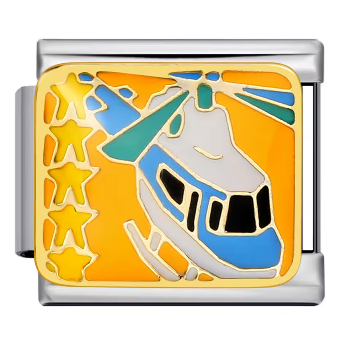 Ce charm italien en acier inoxydable argenté représente un hélicoptère stylisé, accompagné de cinq étoiles, hommage subtil à l’univers emblématique de GTA. Alliant design urbain et audace, ce bijou apportera une touche de caractère et d’originalité à votre bracelet. Facile à fixer, il s’adapte parfaitement à tous nos bracelets italiens composés de 17 maillons extensibles et réglables. Compatible avec l’ensemble de nos charms italiens, ce charm séduira les amateurs de culture pop et de style contemporain.
