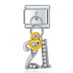 Ce charm italien argenté représente le nombre 21 accompagné d’un petit cœur doré, idéal pour célébrer un anniversaire, une majorité symbolique ou une étape de vie importante. Fabriqué en acier inoxydable de haute qualité avec une finition argentée brillante et un détail doré raffiné, il allie robustesse et élégance. Facile à fixer, il s’adapte parfaitement à nos bracelets composés de 17 maillons extensibles et réglables, convenant à toutes les tailles de poignet. Compatible avec tous nos charms italiens, ce bijou est parfait pour personnaliser votre bracelet avec une touche unique et pleine d’émotion.