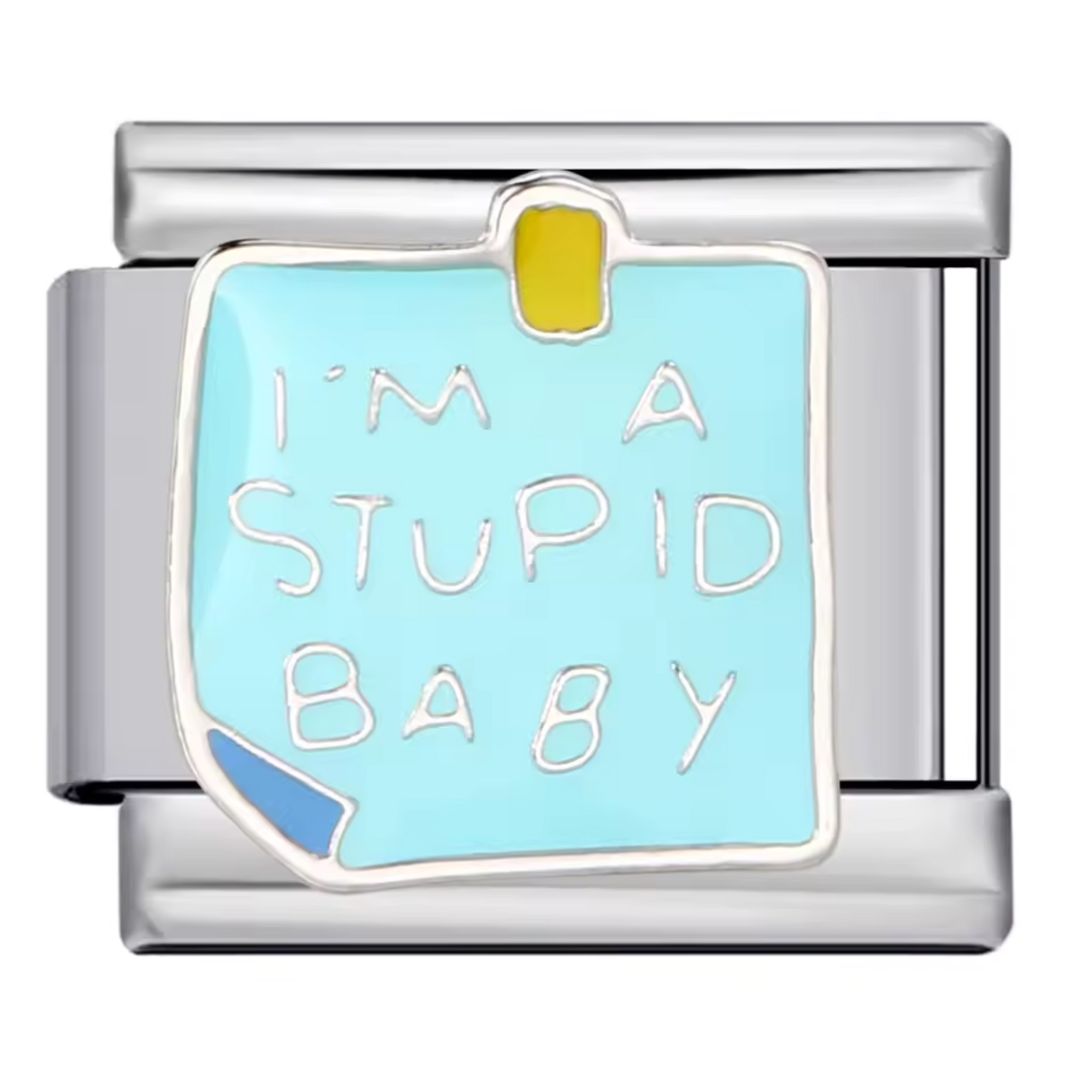 Ce charm italien argenté au design original représente un post-it bleu avec l’inscription “I’m a stupid baby”, pour une touche d’humour et d’audace sur votre bracelet. Fabriqué en acier inoxydable de haute qualité avec une finition argentée brillante et des détails colorés, il associe solidité et style unique. Facile à fixer, il s’adapte parfaitement à nos bracelets composés de 17 maillons extensibles et réglables, convenant à toutes les tailles de poignet. Compatible avec tous nos charms italiens, ce bijou décalé est parfait pour personnaliser votre bracelet avec un clin d’œil amusant.