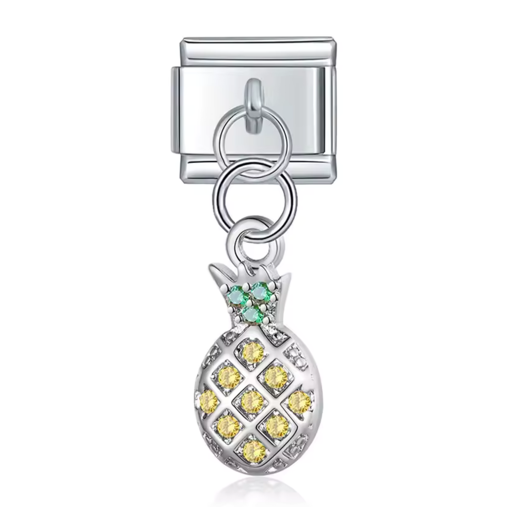 Ce charm italien pendentif exotique représente un ananas raffiné, symbole de convivialité et de bonne humeur. Disponible en trois finitions – dorée, argentée et or rose – il est confectionné en acier inoxydable de haute qualité avec des détails finement ciselés et une brillance éclatante. Facile à fixer, il se balance légèrement pour apporter du mouvement et une touche tropicale à votre bracelet composé de 17 maillons extensibles et réglables. Compatible avec tous nos charms italiens, ce bijou est idéal pour ajouter une note élégante, fruitée et solaire à votre collection.