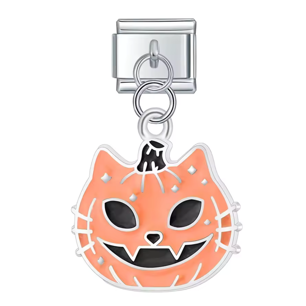 Charm Italien Pendentif Argenté – Chat Citrouille Orange et Noir