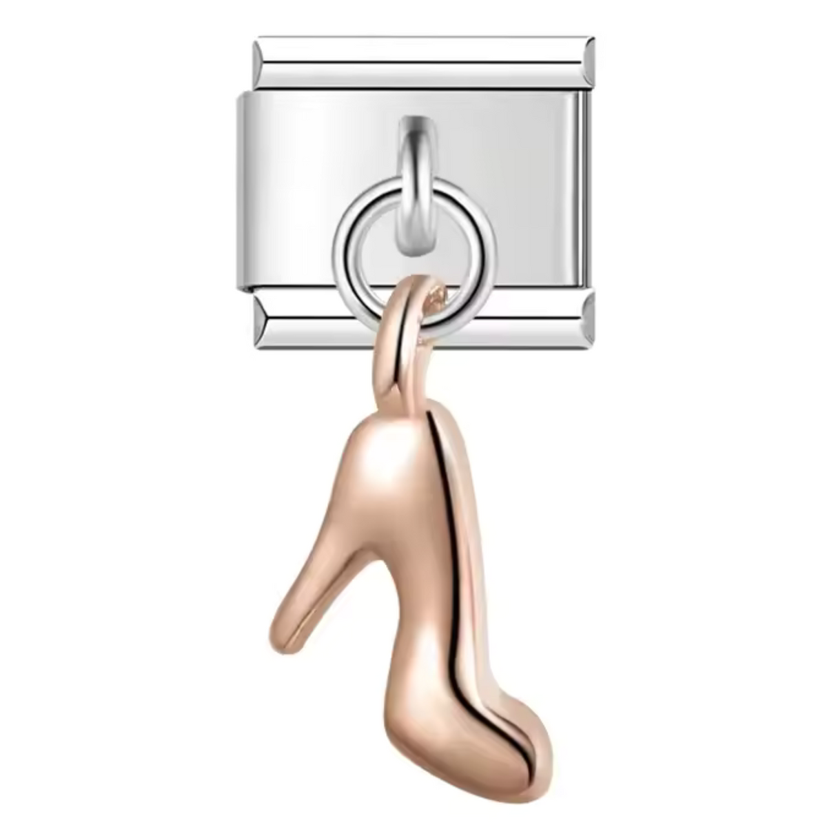 Ce charm italien pendentif argenté est sublimé par un talon or rose, symbole d’élégance et de féminité. Conçu en acier inoxydable de haute qualité, il allie la robustesse de l’argenté à la douceur pour un bijou unique et raffiné. Facile à fixer, il s’adapte parfaitement à nos bracelets composés de 17 maillons extensibles et réglables, convenant à toutes les tailles de poignet. Idéal pour personnaliser votre bracelet avec une touche chic et tendance.