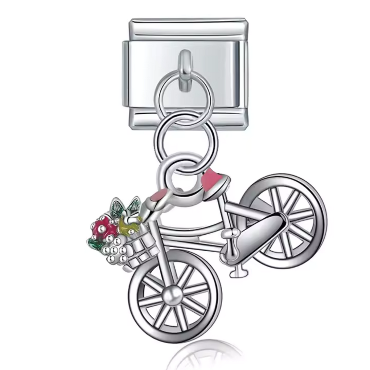Charm Italien Pendentif Argenté – Vélo avec Panier Fleuri