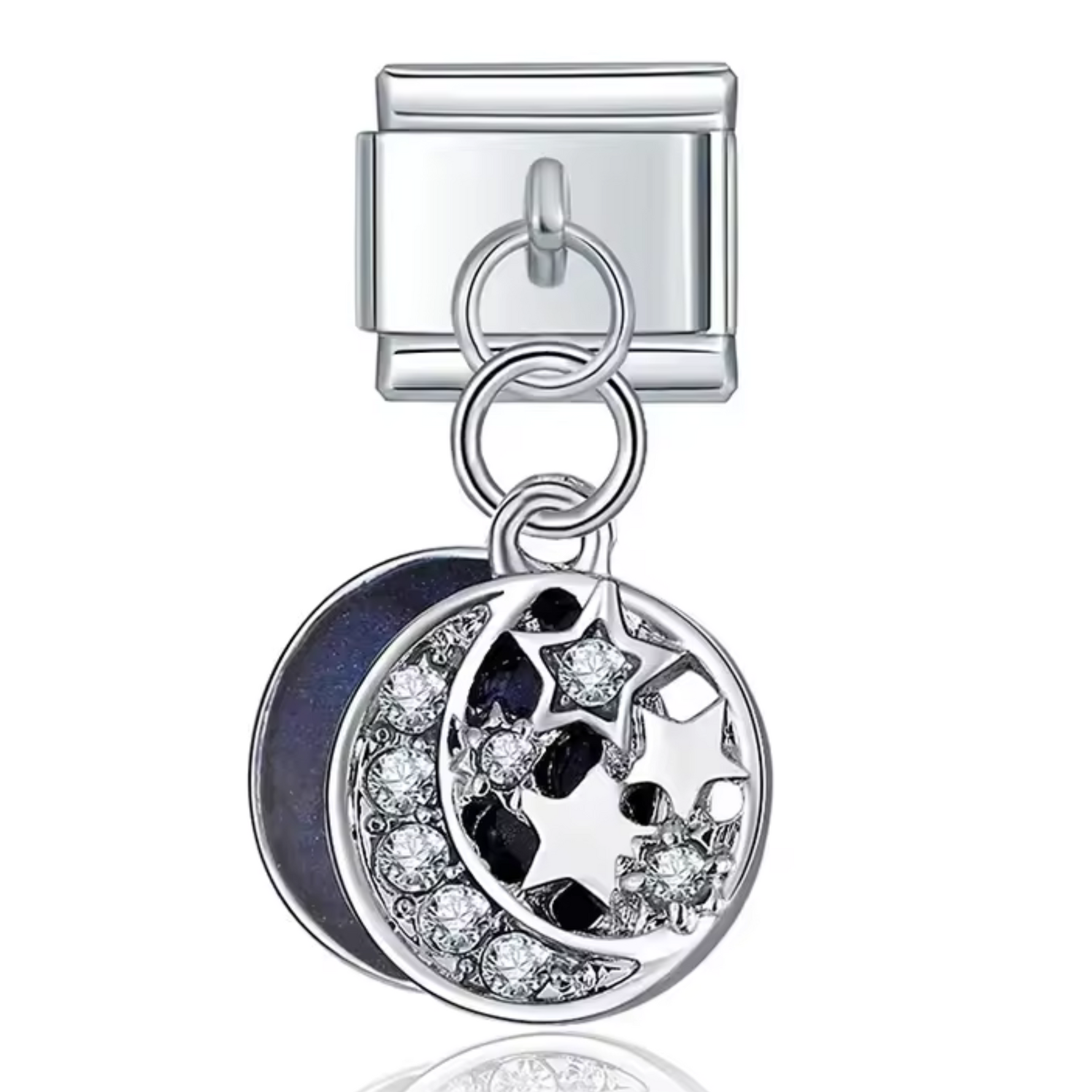 Ce charm italien pendentif représente une délicate lune accompagnée de petites étoiles, alliant élégance et poésie. Confectionné en acier inoxydable de haute qualité, il offre robustesse et finesse des détails pour un rendu moderne et raffiné. Facile à fixer, il s’adapte parfaitement à nos bracelets composés de 17 maillons extensibles et réglables, convenant à toutes les tailles de poignet. Compatible avec tous nos charms italiens, ce bijou céleste est idéal pour apporter une touche de magie et de douceur à votre bracelet personnalisé.
