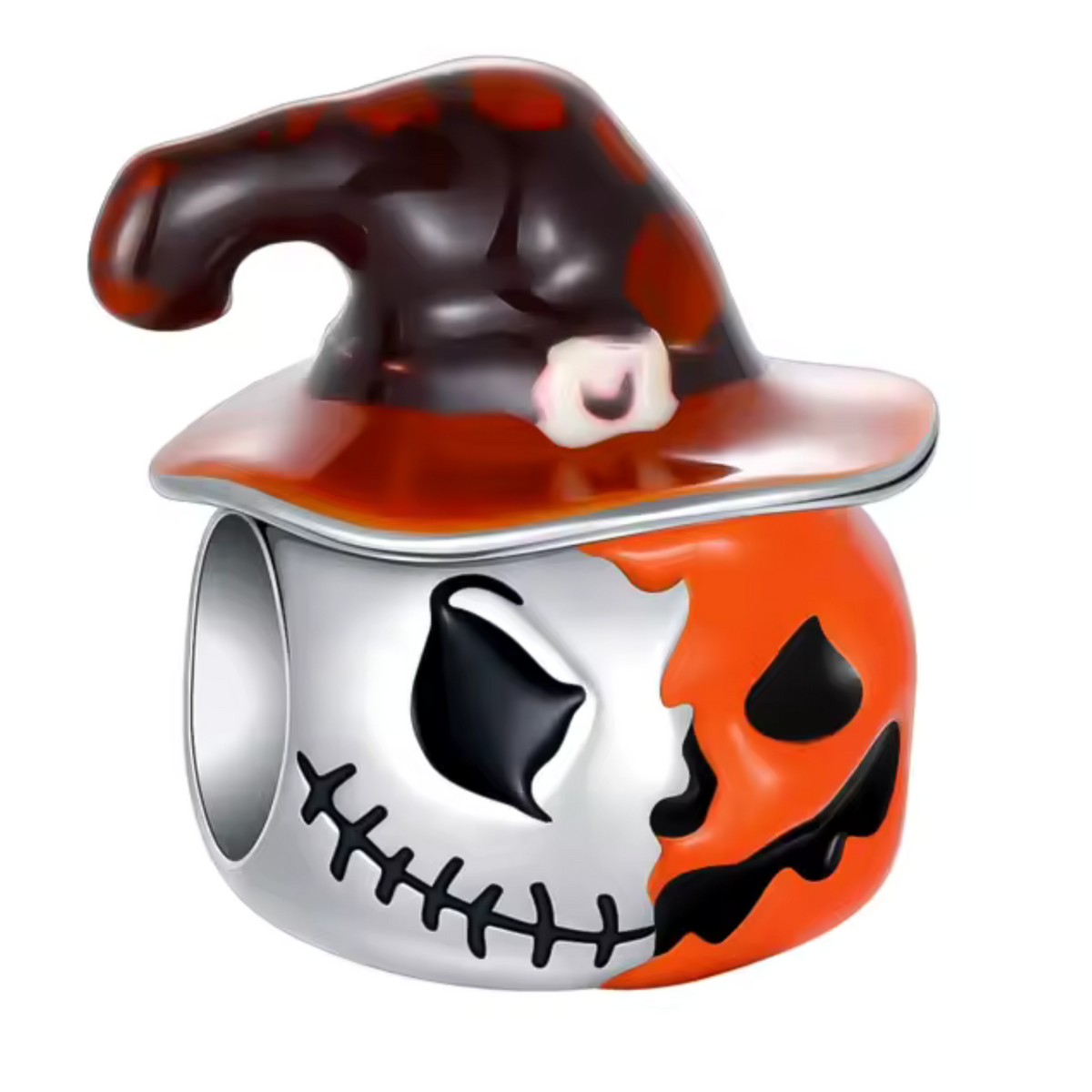 Ajoutez une touche d'effroi et de magie à votre collection avec ce charm Citrouille et Crâne de Sorcière. Confectionné en métal noirci et orange vif, ce charm représente une citrouille sculptée, ornée d’un crâne mystérieux, symbolisant la fusion entre l'Halloween et la sorcellerie. Les détails minutieusement travaillés, des contours de la citrouille aux expressions énigmatiques du crâne, en font un bijou unique pour les amateurs de folklore et de mystères. Compatible avec les bracelets Pandora, ce charm apportera une note ensorcelante et fascinante à votre poignet.