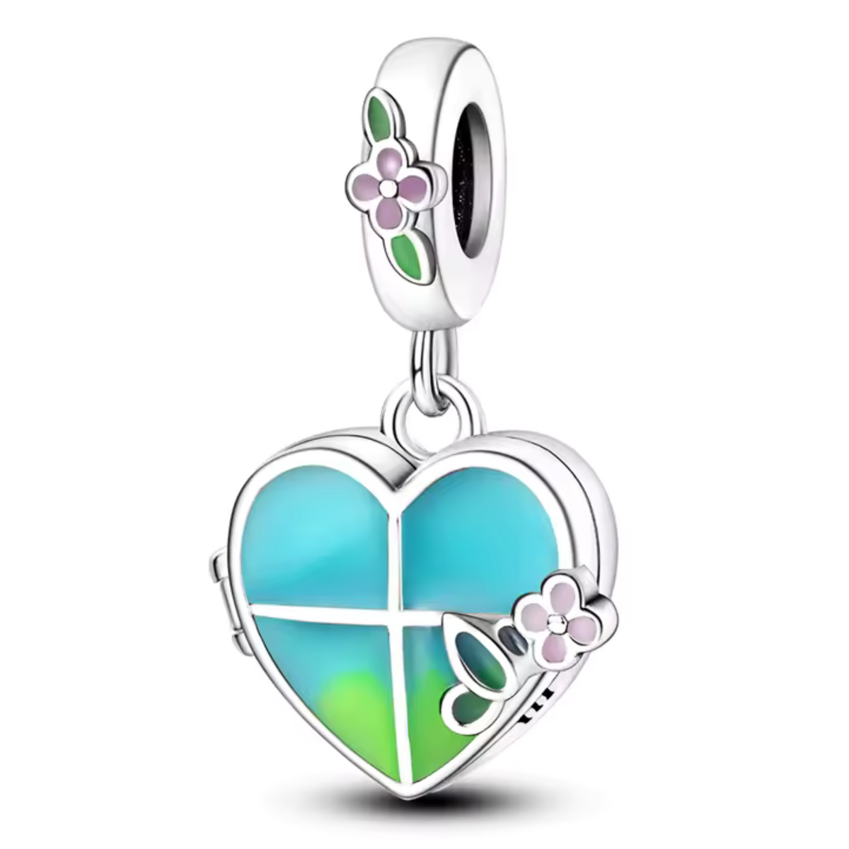 Ce charm délicat en forme de cœur bleu-vert est sublimé par une petite fleur raffinée, symbole de douceur et d’harmonie. Confectionné en argent 925, il allie couleur et élégance pour apporter une touche fraîche et unique à votre bracelet. Parfait pour exprimer votre sensibilité avec style.