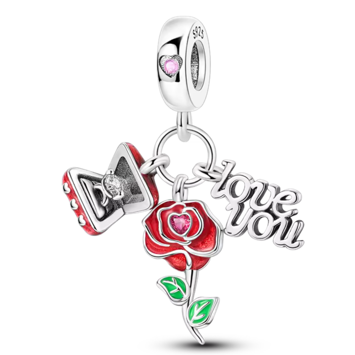 Exprimez vos sentiments avec ce charm combinant une rose élégante, une boîte à bague miniature et l’inscription "I Love You", le tout en argent 925.